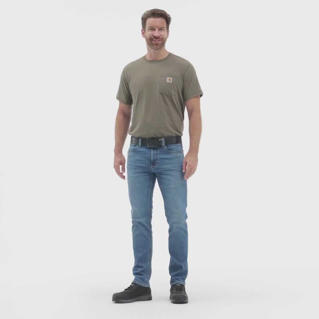 Long hitches or 14-hour days. These men's jeans can stand up to almost anything. They're made of Carhartt's most durable, abrasion-resistant denim with enough stretch for easy movement. Fitted through the hips and thigh, this fit has a slimmer cut and cuffs that fit over most work boots.